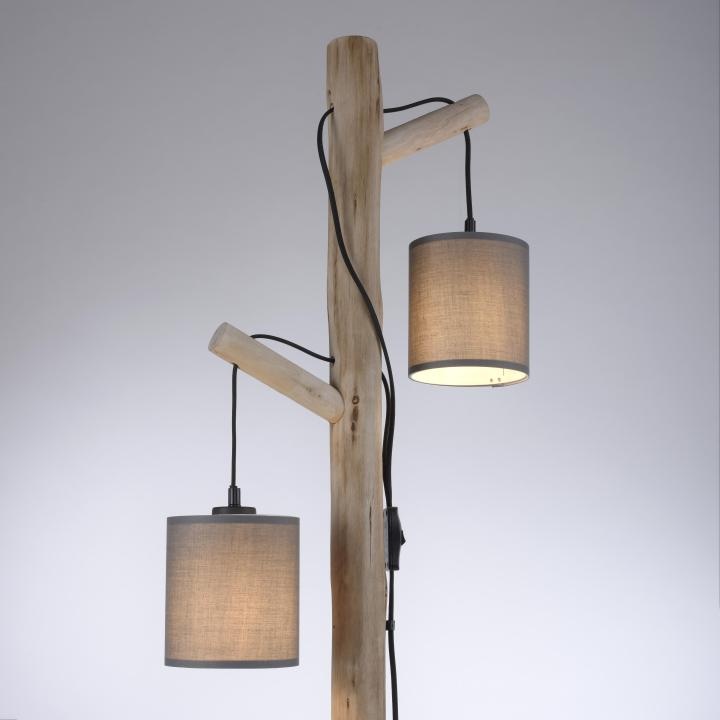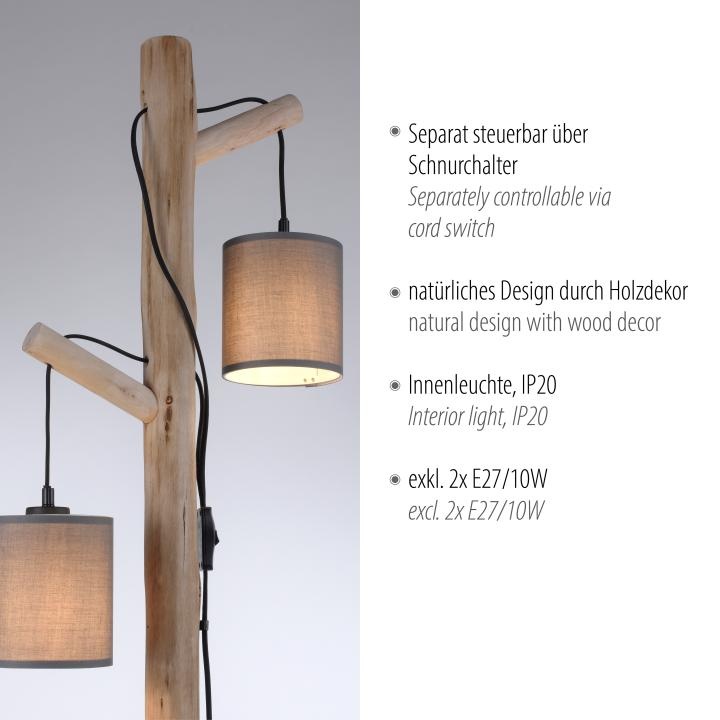 De vloerlamp Tribu heeft een zwarte ronde voet en een frame bestaande uit een houten tak, de tafellamp is voorzien van een schakelsnoer. De twee grijs/taupekleurige stoffen kappen worden vastgehouden met een kabel waaraan de tak is gevestigd. De stoffen kappen heeft een diameter van 13,5 cm en zorgt voor een verblindingsvrije en zachte lichtverdeling. De Tribu vloerlamp wordt geleverd exclusief lichtbronnen en is voorzien van twee E27-fittingen voor lichtbronnen van maximaal 10 Watt. De vloerlamp heeft een voetstuk met een diameter van 39 cm, breedte van 28 cm en een hoogte van 150 cm. De Tribu lampenserie bestaat naast de vloerlamp ook uit een hanglamp, plafondlamp, wandlamp en tafellamp.