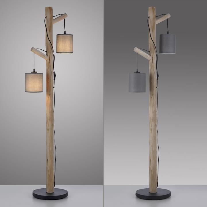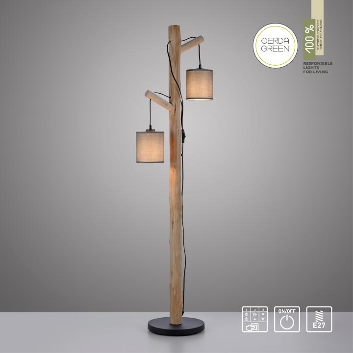 Uit de Gerda Green collectie van Paul Neuhaus: de vloerlamp Tribu. Een bijzondere vloerlamp dankzij de materiaalmix van hout en stof en 100% klimaat geneutraliseerd.