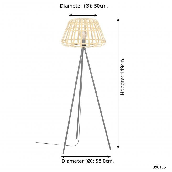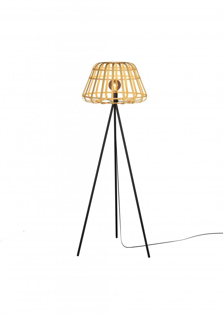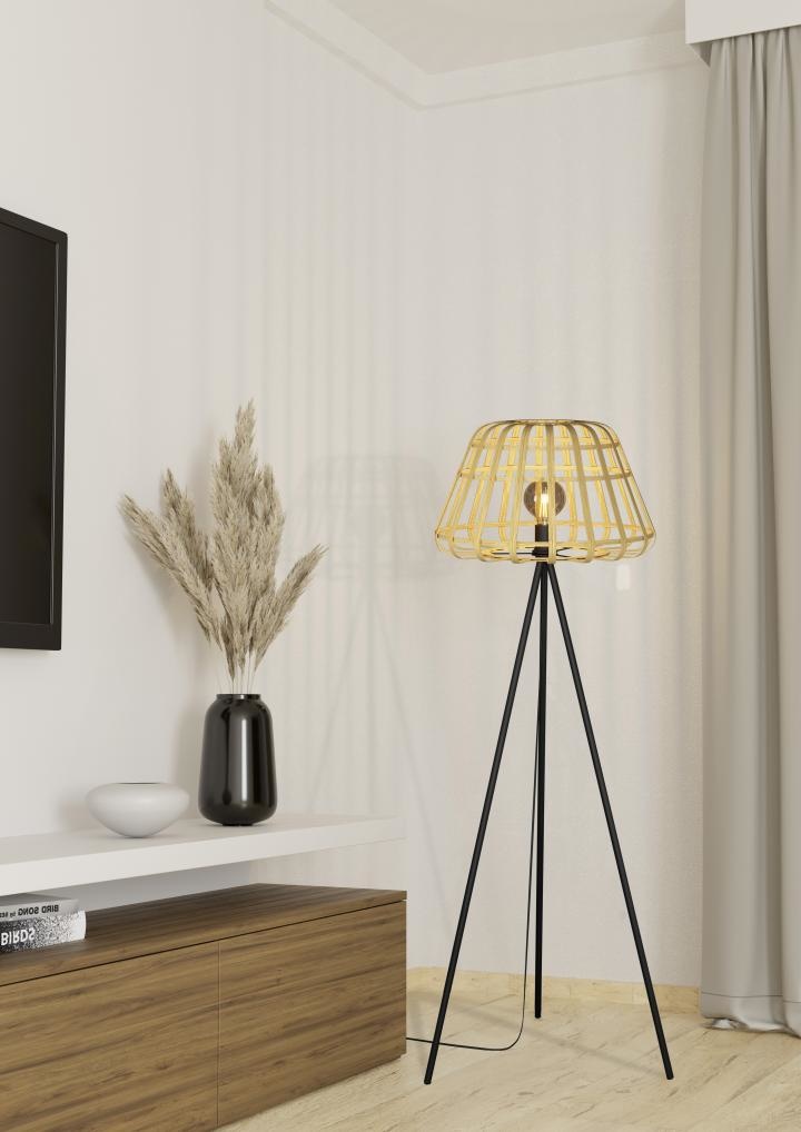 Een vloerlamp uit de Montezuelo serie van Eglo met een natuurlijk tintje, de kooivormige lampenkap zorgt ervoor dat het licht op een subtiele manier reflecteert rondom de omgeving van de lamp.