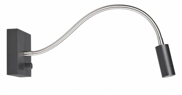 De lamp is uitgevoerd in het nikkel mat en heeft een 3W LED lichtbron (270LM en 2700K). De flexibele stang is maximaal 40cm lang. De wandplaat is 10cm bij 10cm.