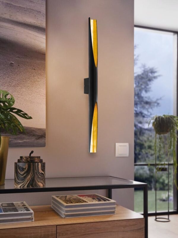 Speelse en elegante wandlamp Falicetto van Eglo. Ook deze serie is nieuw in ons assortiment. De Falicetto wandlamp is gemaakt van aluminium en uitgevoerd in het zwart met een gouden binnenkant. Bovendien is deze wandlamp dimbaar.