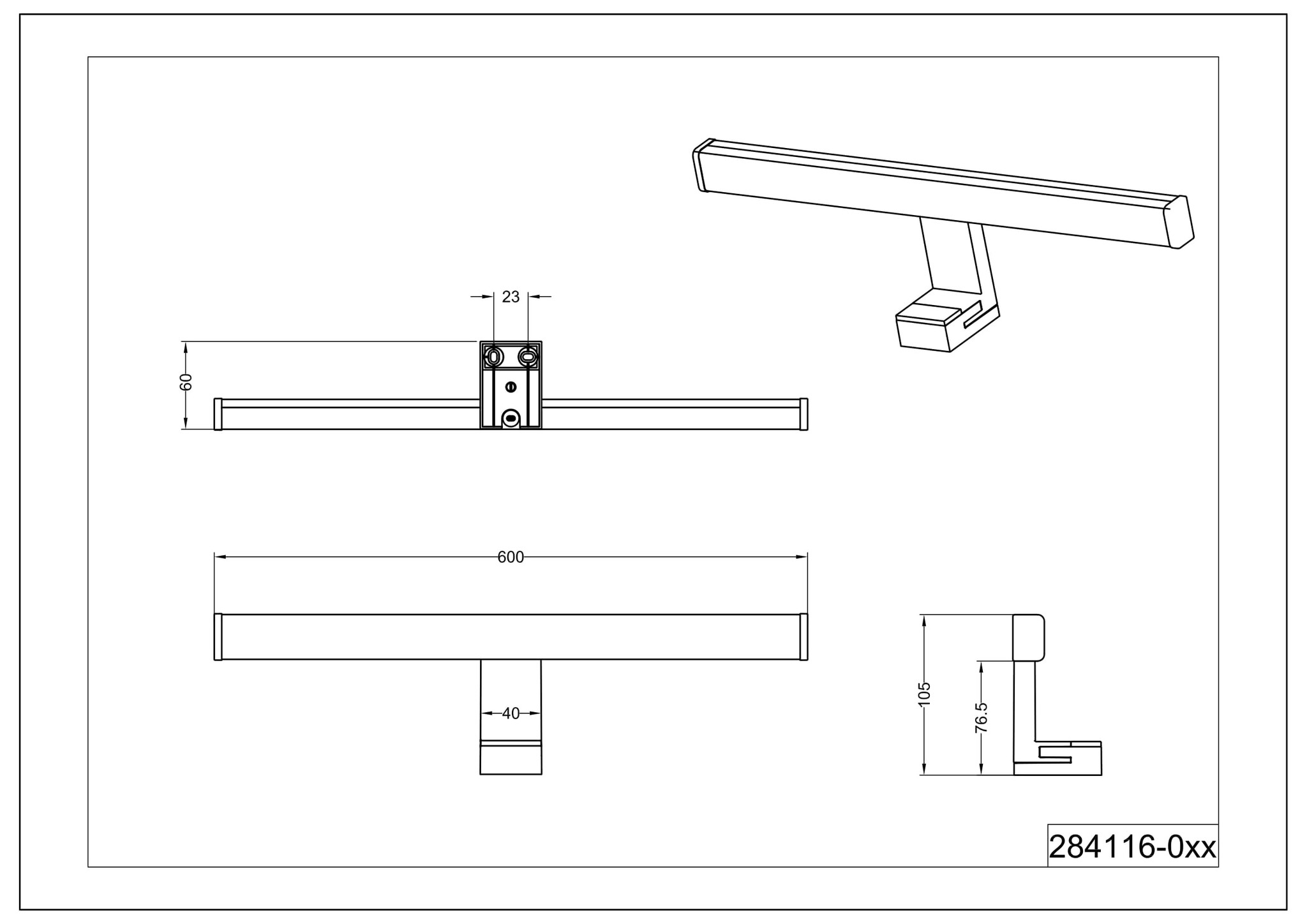 De lamp is voorzien van een geïntegreerde LED-lichtbron van 12 Watt, heeft een lichtopbrengst van 1200 Lumen en een lichtkleur van 3000 Kelvin. De wandlamp is 60 cm breed en heeft een hoogte van 4,4 cm. De wandlamp komt 10 cm van de wand af.